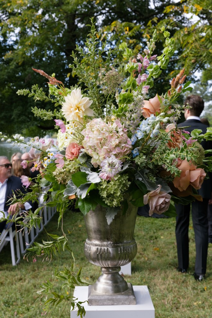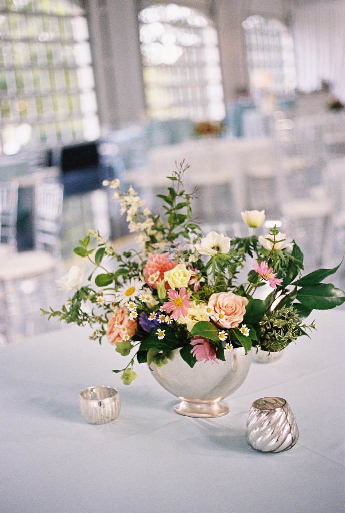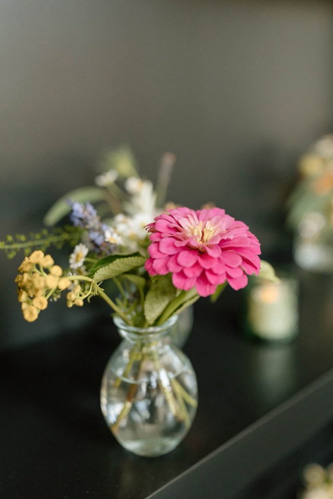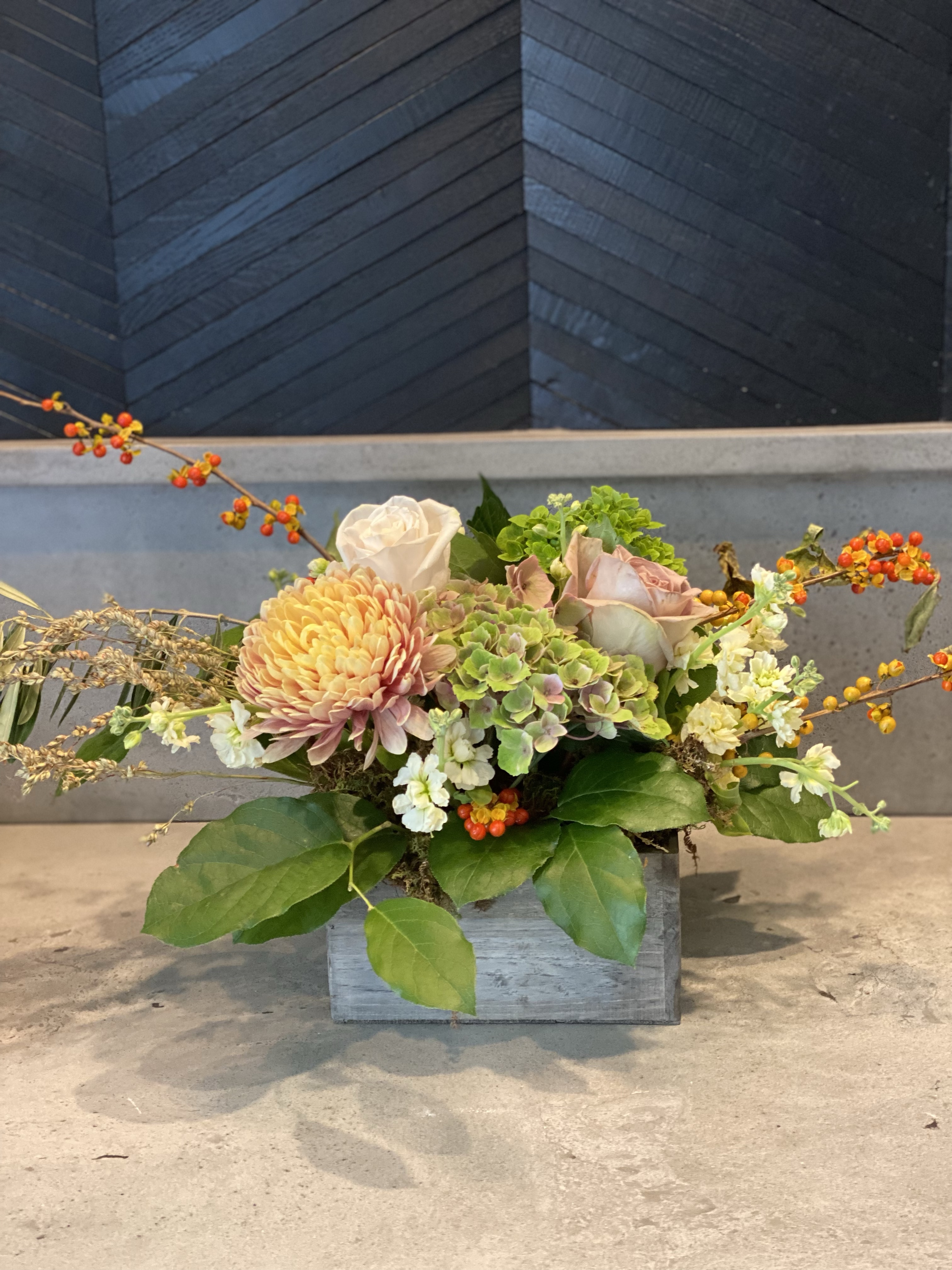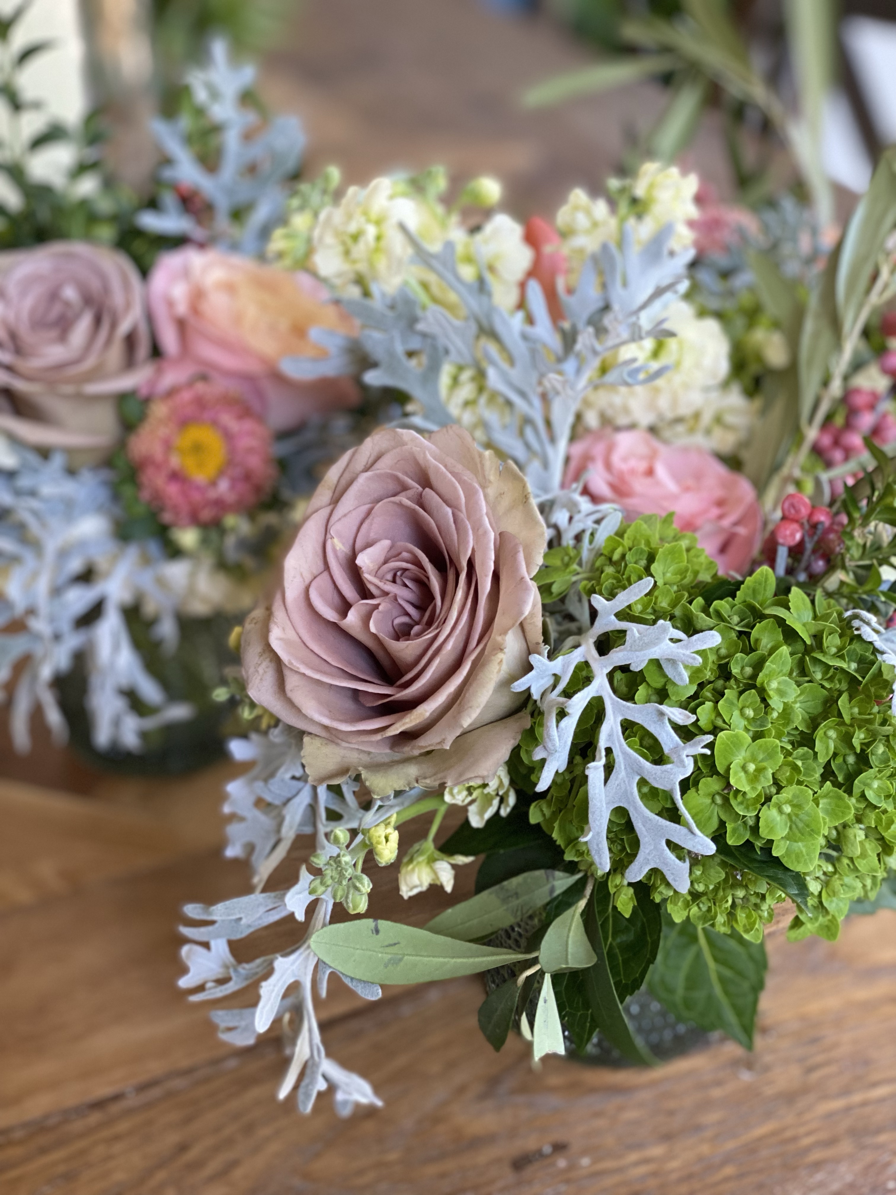 Each of our arrangements is unique. So, whenever possible, we will use a vintage vase or bowl, insert some just picked leaves or put in a fun branch.