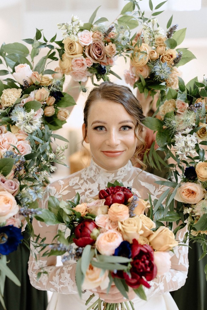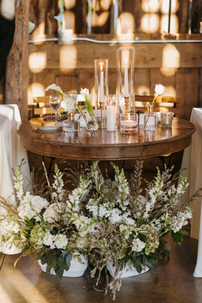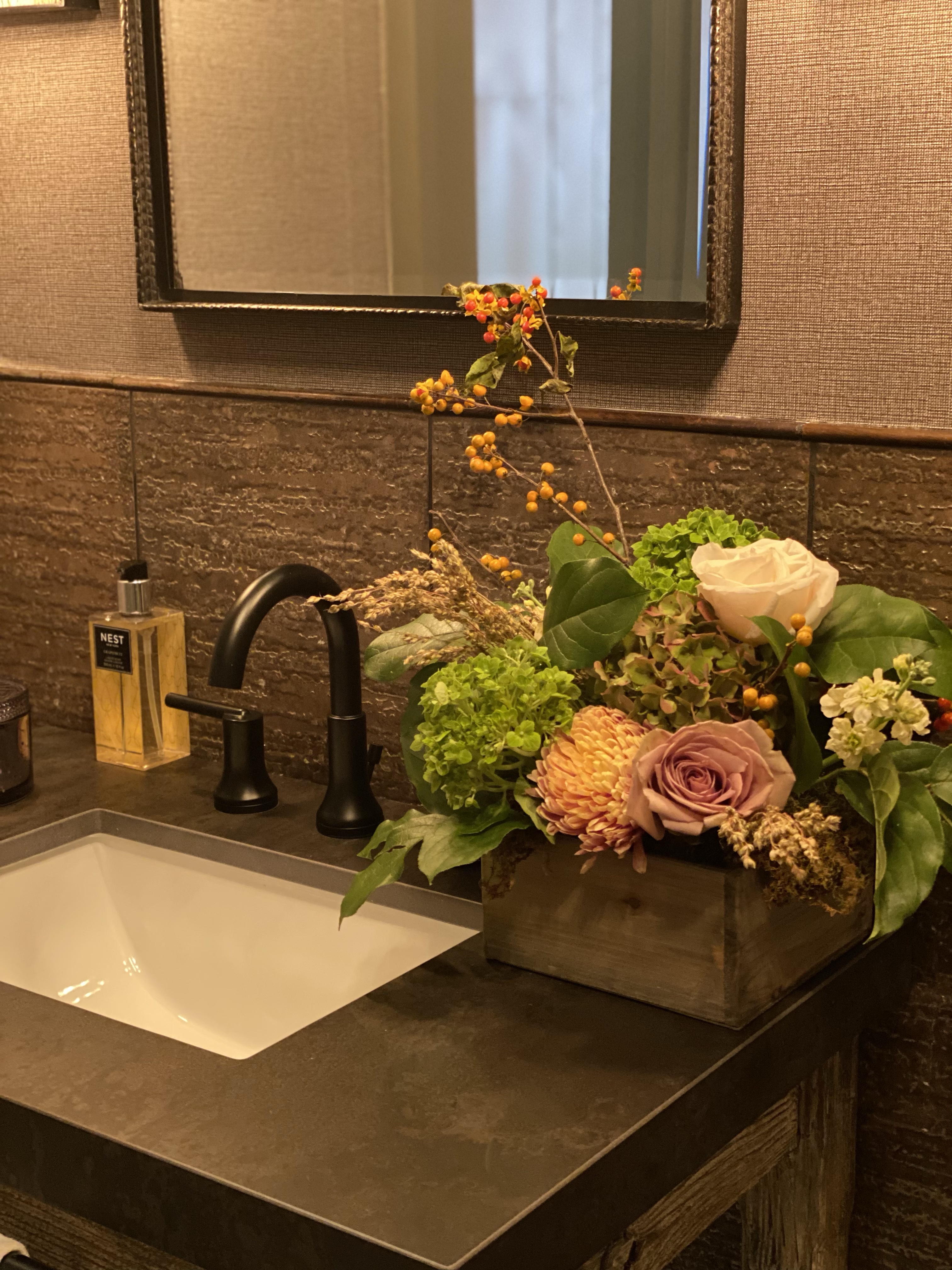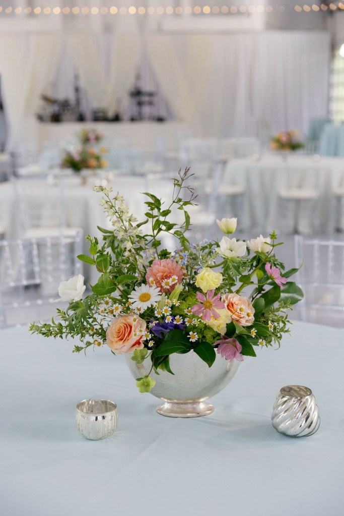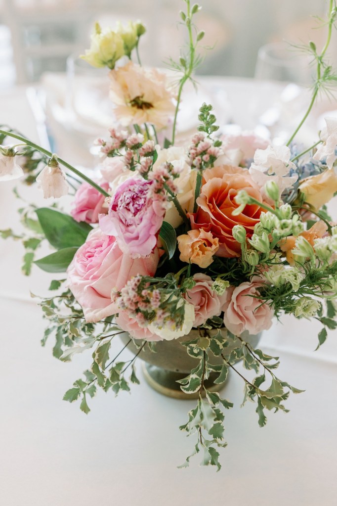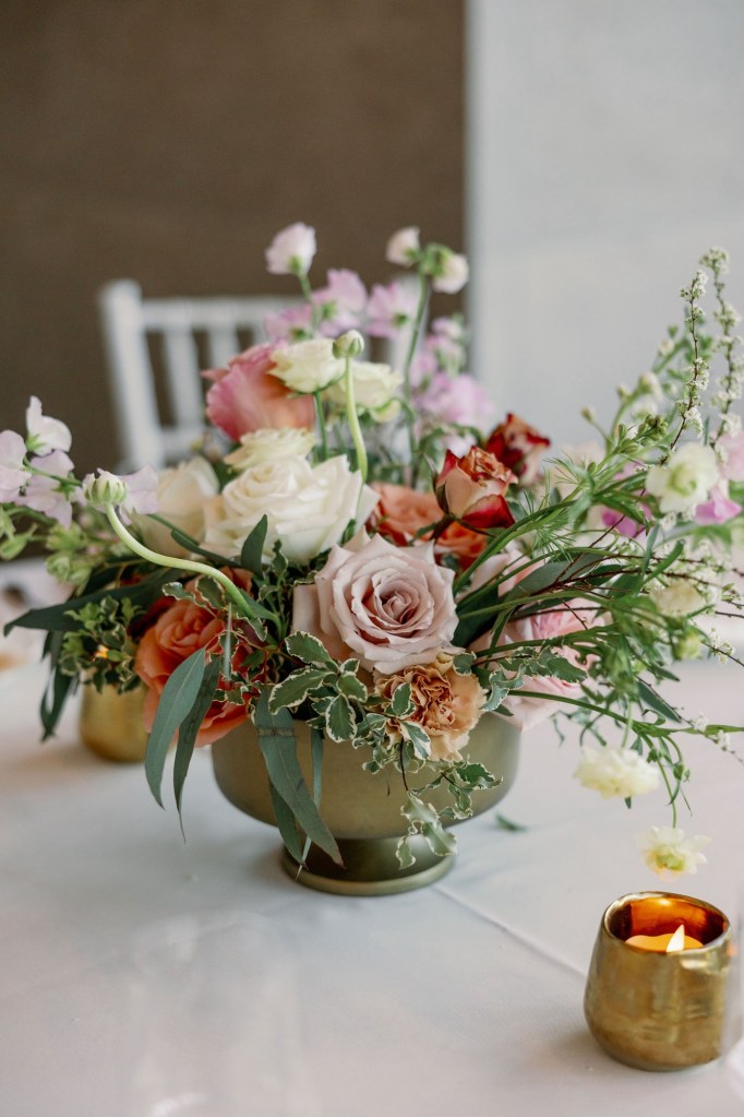 Each of our arrangements is unique. So, whenever possible, we will use a vintage vase or bowl, insert some just picked leaves or put in a fun branch.