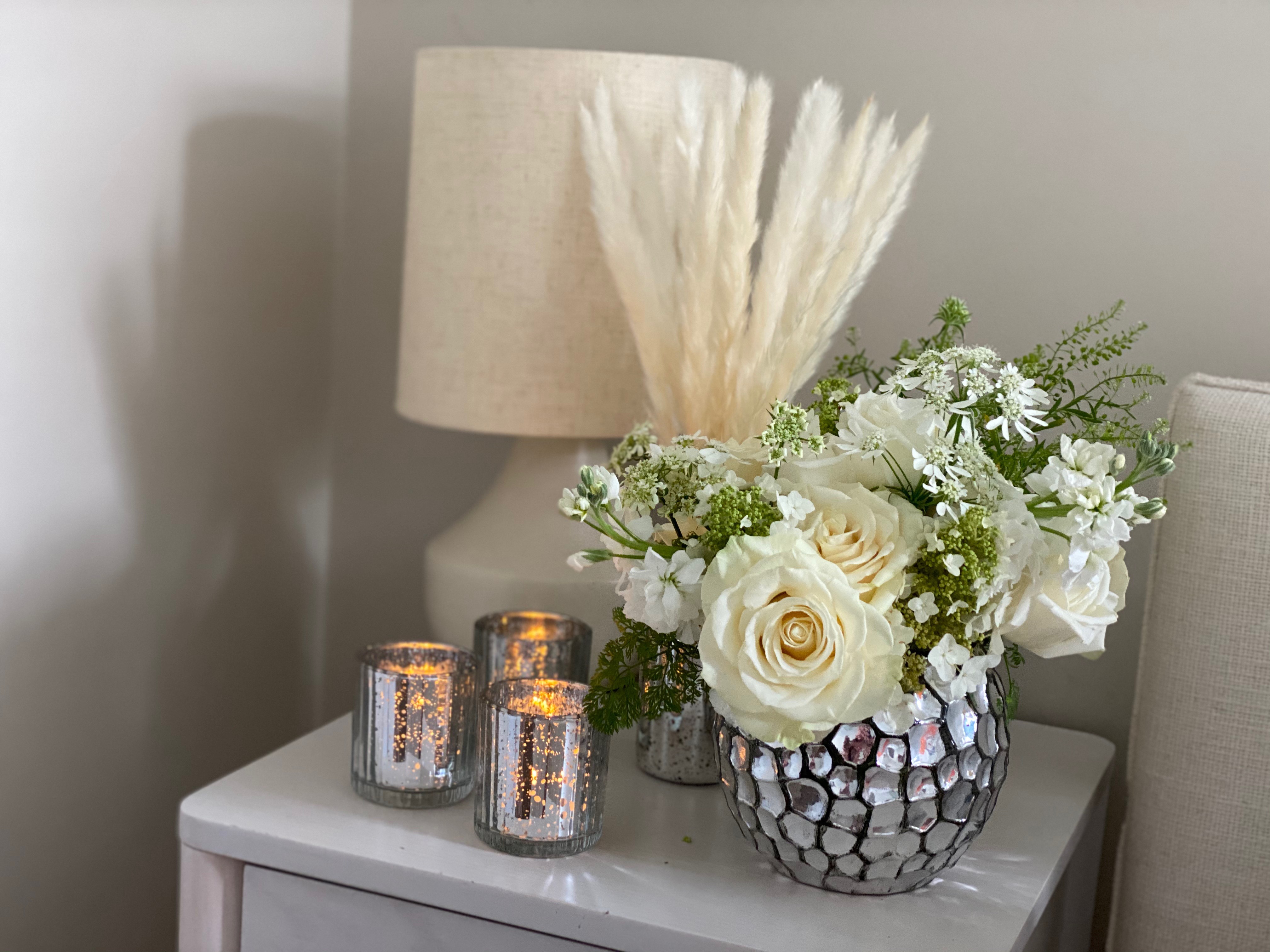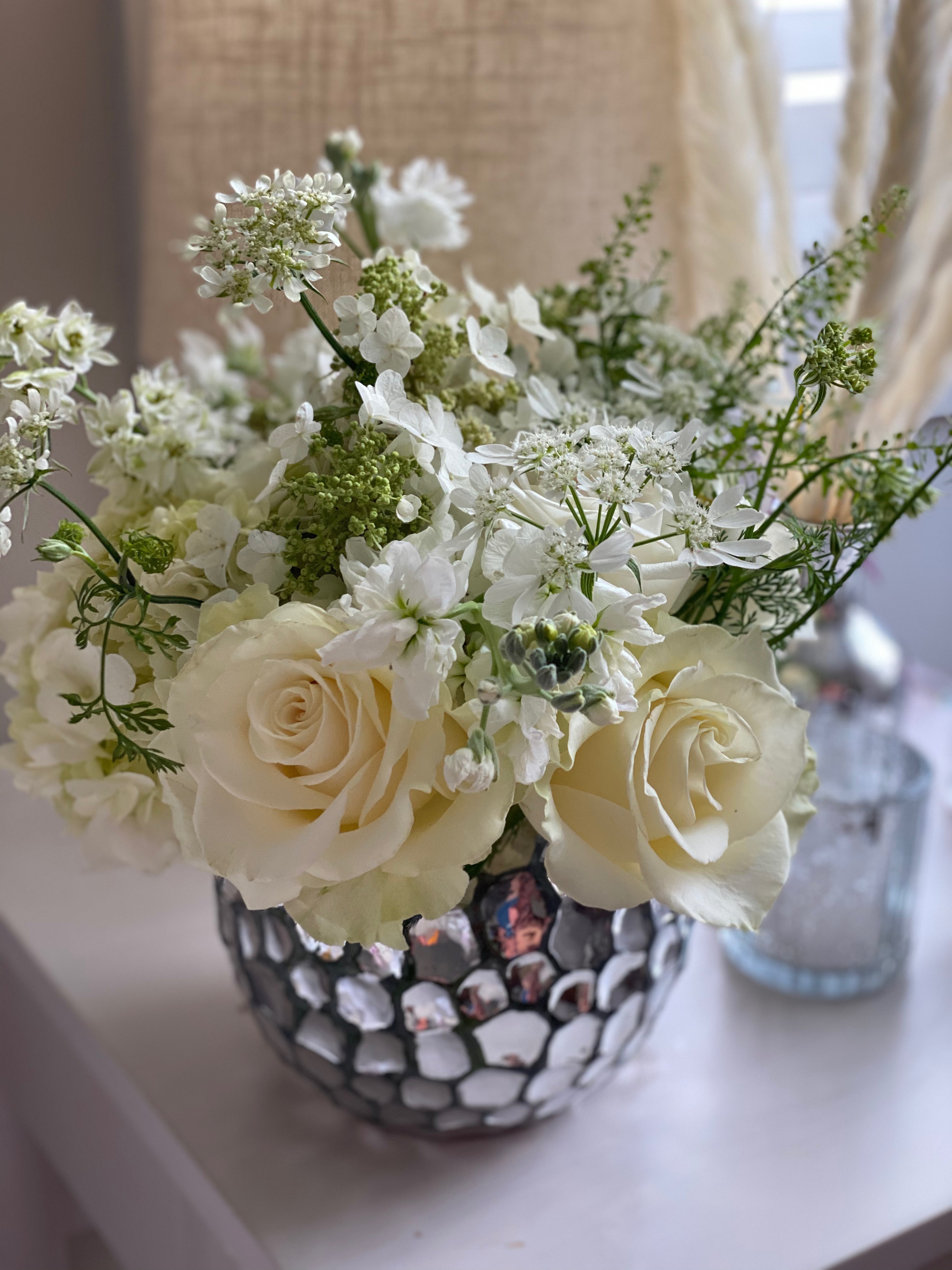 Each of our arrangements is unique. So, whenever possible, we will use a vintage vase or bowl, insert some just picked leaves or put in a fun branch.